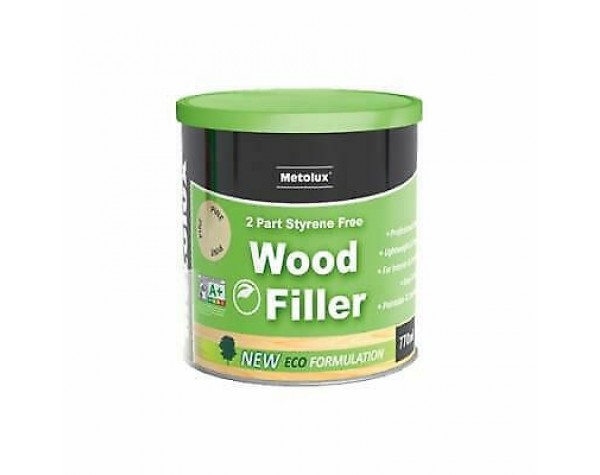 Metolux 2 part styrene free wood filler is a pre-coloured, high performance, two component polyester filler that provides a tough, long lasting repair to all woods. Once mixed, the filler sets hard to a shatterproof finish in approximately 30 minutes (for deep fills) and may be drilled, carved or planed once dry. The system is weather proof for both interior and exterior use, typical applications include:- Repairing wood damaged by wet rot. General wood filling in window sills and frames, doors and door frames, banisters, MDF etc. Furniture repairs. Repair of wooden constructions including some marine applications. Grain filling and repairs to shakes, cracks, splits and knot holes.